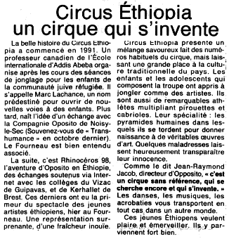 Wow! WATCH THIS! (in reference to The Lowdown TV documentary on Circus Ethiopia aired May 5, 1998 on BBC1) Tony Morrissey (posted on Usenet May 5, 1998) I saw Circus Ethiopia last summer (97) at WOMAD, Reading. It was one of the most compulsive, exciting and inspiring things I've seen. It's hard to say why, but knowing that these kids put together a highly professional show in a tiny African circus village and resurrected their whole lives' possibilities was part of it. At the end practically the whole audience was shedding tears of joy - I'm not kidding, it was extraordinary. The kids range from tiny to late teens, and present a unique combination of western skills with home made props, plus a large amount of very high level acrobatics. I was prepared to be generous and watch a deprived group of kids do some half-baked skills cobbled together into a slightly embarrassing show. Far from it - the skills range from good to incredible, and the show is uniquely African, with lots of narrative scenes, dancing, music, adventure, and audience participation. And they smile! They grin the whole time with such joy, generosity, ebullience - you can't help love them. And a funny thing happened. I was
