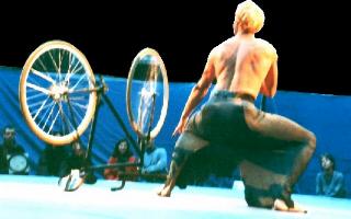 L'Amant fait taire les ricanements de ses femmes et du public en posant devant son vélo comme devant une Ferrari, puis en le chevauchant en amazone, vêtu d'une jupe longue. |