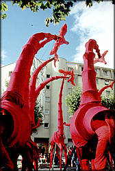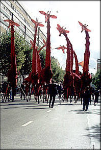La ville est le cadre d'un ballet magenta mené par ces cous immenses.