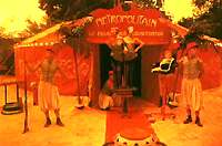 Le Palais des DécouvertesBaraque à phénomènes (1993)Joc, le petit homme de cristal est bonimenteur et propriétaire de l'attraction. S'élevant sur son trône hydraulique, il s'écrie: «je vole... je vole, je suis le plus grand du monde». Sur un piédestal, sa femme, la «grosse caisse», vend les tickets: «Allons mes chéris, une petite escapade dans la cinquième dimension? un voyage au centre de la vie?», promenant son énorme poitrine sous le nez des premiers rangs. Leurs filles , les siamoises, placées à l'entrée du Palais, poinçonnent en cadence les premiers billets. A l'intérieur, cinq zouaves, s'affairent autour du phénomène, plastiquement parfait, «la honte de la famille». Fragile équilibre de la normalité et de l'anormalité, le Palais des Découvertes trouble notre perception des formes,... du fond. |