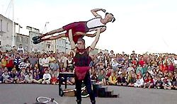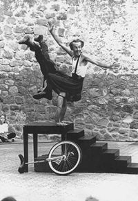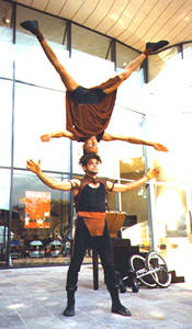 Hiver 97/98 : Avec l'aide d'Arian Miluka pour les techniques acrobatiques et de Karina Bonan pour la mise en personnages, ils créent le duo d'acrobatie burlesque NICO et ARNO : deux acrobates, deux monocycles, une table, un escalier et une valise. Le 1er mai 98 a lieu la première représentation de NICO et ARNO, spectacle de rue de 30 minutes qui obtient le prix de la "Jeune Compagnie Repérée" au Festival des Arts dans la Rue - Morlaix'98. saison 98 : 22 représentations dont Le Festival du nouveau cirque, le FAR de Morlaix, les Affranchis, les Scénomanies, Châlons dans la rue, les Virevoltés. Printemps 99 : Travail sur la mise en scène du spectacle, 30 min Saison 99 : 47 représentations dont La nuit des Arts de la rue, Trapezi, Parade(s), la STRADA, les Jeudis du Port, La plage des six pompes, Eclats, les Fondus du macadam, Au bonheur des Mômes, les nuits foraines, Saison 2000 : Du nouveau dans les accessoires : une Planche de bois. 40 min de spectacle. 31 représentations dont Magdalena circus, Cibulàk, les Folies, la Déferlante, Les Unes Fois d'un Soir, Festival des Artistes de Rue, Festival des Arts dans la rue, Festival de Saragosse. Pour la saison 2001, nous ajoutons de nouvelles prouesses : 45 min de spectacle. |