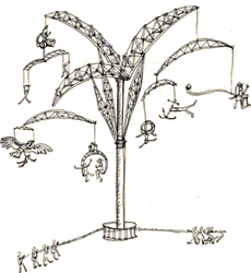 structures suspendues dans le ciel par des grues de chantier, "l’Arbre à Rois" est