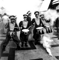 cadence, et minois malicieux." Fer de lance de la Compagnie Transe Express, Les Tambours allient les techniques du fameux "Tambour Français" aux chaleurs des rythmes africains puisés lors d’un séjour de 7 mois en Afrique de l’Ouest. Deux ans plus tard, Gilles Rhode, nostalgique de Calder, dessine Mobile Homme, premier né des mobiles aériens. Cette création originale intègre les tambours en déambulation et se clôture par un final à très grande hauteur. |