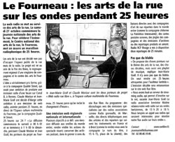 Le samedi 27 octobre 2007, dès 00h01, Artistes et Passeurs des arts de la rue s’adresseront en direct de Brest aux oreilles du monde entier via « 25 HEURES SUR 24 », un marathon radiophonique de 25 heures alimenté des 4 coins de la planète par une pléiade de contributeurs et relayés en régions par des radios partenaires. La technique radiophonique sera assurée par la radio rennaise Canal B, l’Espace Culture Multimédia du Fourneau veillera à la mise en ligne des supports et à la diffusion sur le net en direct tandis que les micros seront aux mains de la Compagnie Qualite Street...