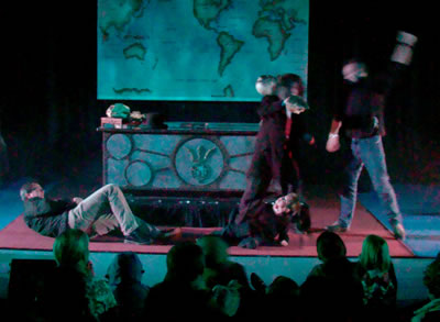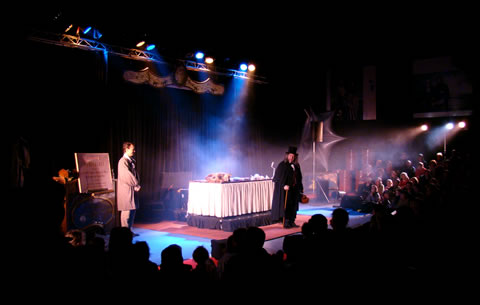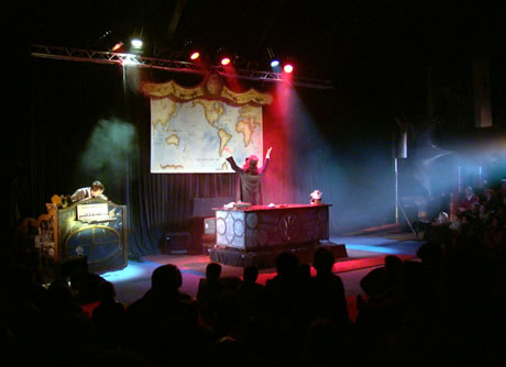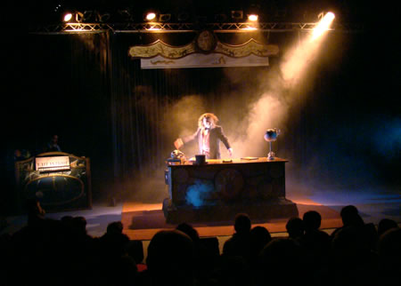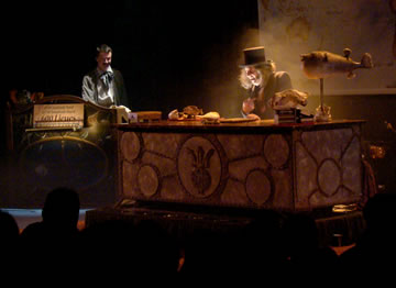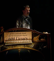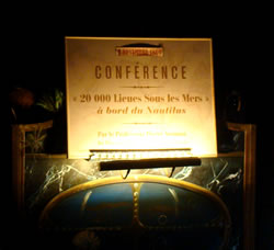 Dans cette étonnante adaptation du chef d’oeuvre de Jules Verne, le public assiste à la conférence du truculent Professeur Aronnax sur son odyssée à bord du Nautilus. À l’aide d’un crâne de tigre, d’os, d’animaux empaillés et d’un incroyable bureau à transformations (14 moteurs et machines incorporés), le célèbre naturaliste du Muséum de Paris enveloppe, emporte le public dans son aventure hors du commun jusqu’à se battre contre un requin, un poulpe géant, etc... Un One Man show entre conte fantastique et marionnettes décalées, dans une mise en scène spectaculaire, drôle et lyrique !