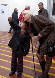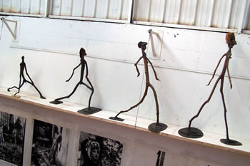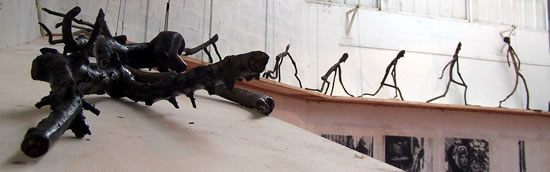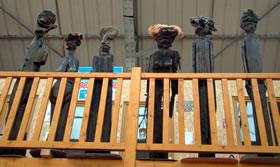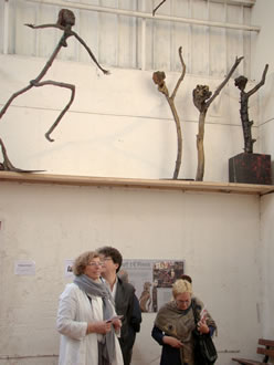 Après avoir exposé sa genèse et ses grotesques à l'Abbaye de Daoulas (2007-2008), puis à Océanopolis (en 2008), Jean-Jacques Petton, sculpteur pinseyeur, a prolongé les 9 sculptures de sa genèse par 4 « volants ». Son exposition dans le hall de l'aéroport de Brest-Bretagne (en 2008-2009) lui a fourni l'occasion de cet envol, symboliquement lié au lieu. A partir du 16 avril, c'est au Centre National des Arts de la Rue le Fourneau que Jean-Jacques Petton a installé 14 de ses grotesques, dont 4 gesticulateurs et une version plus complète de la genèse et de l'envol, qui présentent aujourd'hui 15 sculptures dont 5 « volants ». Dans une époque de crise économique où dans les médias, mais aussi dans les conversations courantes, on ne parle que de fric, de baisse de pouvoir d'achat, du CAC 40 qui dégringole, etc... Ne nous laissons pas envahir par les contingences matérielles et fuyons une vie trop terre à terre. Un élan poétique peut nous aider à échapper à la grisaille du quotidien. Rêvons ! Pour pouvoir réaliser quelques uns de nos fantasmes... Grâce au Fourneau et avec le Fourneau, prenons le temps de l'envol, symbole d'un message d'espoir. |