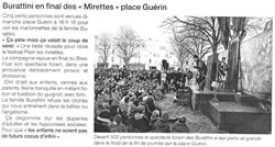 Dimanche 13 décembre, 16h16« Il fait froid, mais ça valait le coup de venir », entendait-on dans le public a la fin du spectacle T'as d'beaux yeux tu sais Carabosse, présenté par l'illustre Famille Burattini en clôture du festival Plein les Mirettes. Ce dimanche 13 décembre place Guérin à Brest, c'est dans l'esprit du Théâtre de Guignol que Rita et Burattini ont appris aux enfants à jouer des coudes. Tout y est passer : les CRS, l'argent, le machisme, ... le tout au milieu d'éclats de rires qui ont permis aux 500 petits et grands présents de se réchauffer en cette fin d'après-midi d'automne.