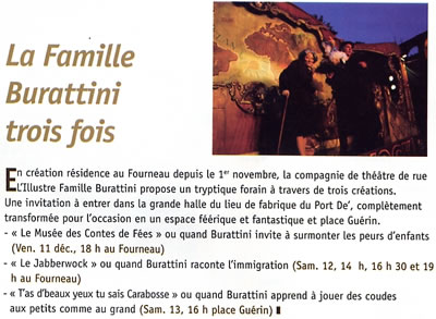 Cette collaboration est l'occasion de découvrir ou redécouvrir l'univers forain de l'Illustre Famille Burattini au travers de trois créations, dont Le Musée des Contes de Fées, en résidence de création du 1er novembre au 13 décembre au Fourneau. Une invitation à entrer dans la grande halle du lieu de fabrique du Port De', complètement transformée pour l'occasion en un espace féérique et fantastique...