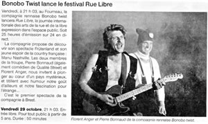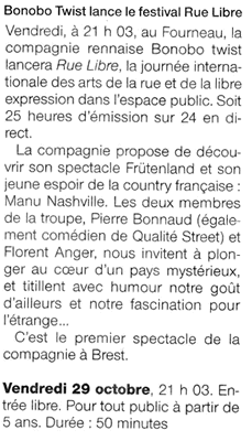 Pour la première fois à Brest, Frütenland, la bonne bière au goût de fruit, vous propose de découvrir un jeune espoir de la country française : Manu Nashville. Nul doute qu'entre deux compositions de son cru, Manu Nashville rendra hommage à la Frütenland, la bonne bière au goût de fruit qui lui apporte énergie et inspiration dans ses efforts au quotidien...