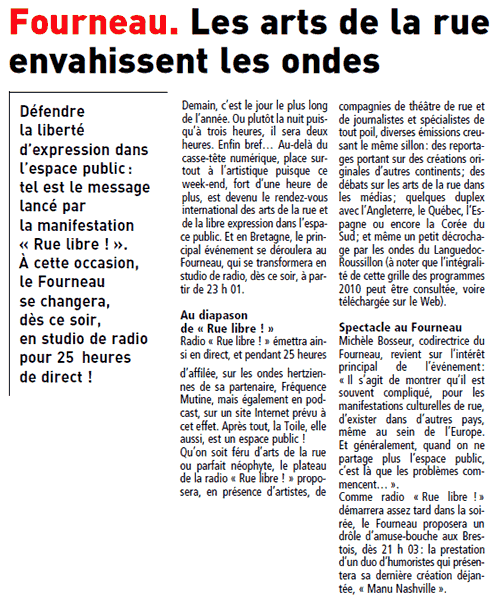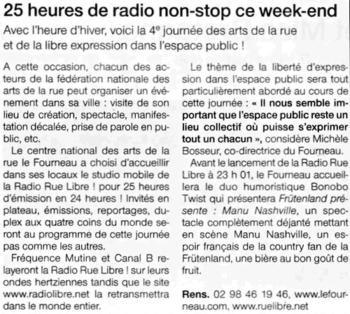 Dans son lieu de fabrique brestois, le Fourneau accueille le studio mobile de la Radio Rue Libre ! pour 25h d'émission sur 24 en direct : invités en plateau, reportages, présentation des actions mises en œuvre, duplex aux quatre coins du globe...