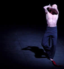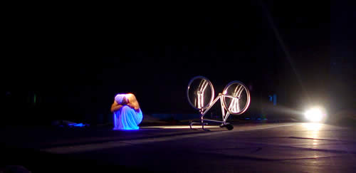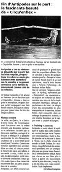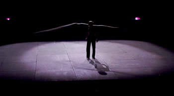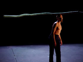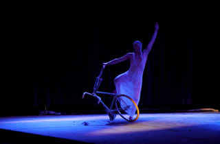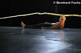 Cirquenflex.homme remet en cause les habitudes de la perception. Il s‘ agit de déstabiliser et d‘ émouvoir le public, un instant, par des choses belles et apparemment impossibles. Le fait qu‘ un homme, seul soit présent sur scène, crée une intimité qui ne ressemble en rien à un cirque commun. Le public suit ce personnage à travers un rêve fait de loufoqueries quotidiennes. La danse, les images animées et l’acrobatie traditionnelle se mélangent, horizontalement et verticalement, avec beaucoup d’effronterie et de poésie. |