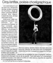 Fabian Nichele (acrobate, danseur), Bea Nichele (mise en scène), Gabriel Kortmann (costumes) Hellblau (lumières) Catherine Rutishauser (technique) Martine Mosimann (communication) Roger Merguin (manager) Contact : Fabian et Bea Nichele Wigli / Catherine Rutishauser 0041(0)61 382 91 85 / cirquenflex@dplanet.ch / Management : Roger Merguin : roger.merguin@freesurf.ch / www.cirquenflex.ch |