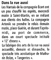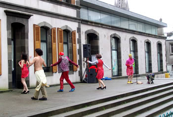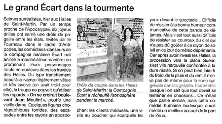 "...Cette fresque baroco-burlesque qui chevauche lieux communs, pub, glamour, beaufs, pétasses, ploucs, stars, bourges, snob, twist, cinoche... et autres chanteurs de charme, se déguste comme un patchwork hellzapoppinesque (sans cavalerie), où des comédiens-danseurs (et inversement) frénétiques et déjantés, franchissent au rythme - et dans la forme - d'un spectacle de rue, des modes, des postures et des événements dont la chronologie et la logique sont complètement exclues. Ca déborde de tous côtés, ça improvise, ça pourfend, ça chahute, ça danse, ça grimace, ça rigole et ça pleure au gré des transformations des personnages, s'inscrivant dans autant de tableaux acidulés."