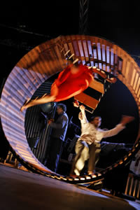 Le cirque se fait épure, la danse vol d'oiseau, l'acrobatie projette les corps, les musiques traversent le temps et l'Europe… mais les trampolines, tapis roulants, roues, mâts, tous ces outils renvoient aussi à une humanité en proie à la destruction.