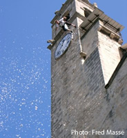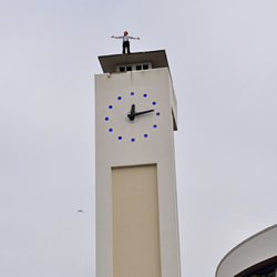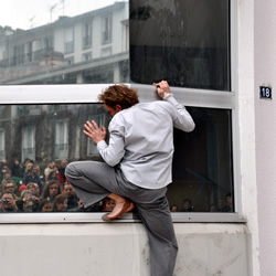 Aux premiers coups de sifflet voici tous les nez levés. Perché au sommet de la grande horloge de la Gare de Brest, Antoine Le Ménestrel, salue son public venu en nombre pour ce premier spectacle du Festival DañsFabrik. 12h12 pétantes : les premières notes de musique retentissent marquant le début de cet étonnant numéro de voltige. Tête en bas, il descend lentement en rappel le long du monument, telle une araignée au bout de son fil. Il épouse les formes et les contours, remplit les vides et englobe les pleins dans une chorégraphie hypnotique et aérienne. Dans ce langoureux balancement, les lois de la pesanteur sont délicieusement modifiées. Le corps au ralenti gravite autour de l'horloge et explose la notion du temps. Tour à tour jouant à l'homme-araignée, la bête urbaine, au Manneken-Pis brestois, semeur de plumes et de cœurs en papier, Antoine Le Ménestrel explore, « à tous les étages », les circonvolutions de cet espace du quotidien devant lequel on passe chaque jour mais sans jamais vraiment le regarder.