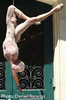 Les images défilent. Portant sur la tête une couronne d'épines sertie de billets, il devient Christ des temps modernes. Brûlant son billet de 500 euros et brandissant sa flamme de la main droite c'est au tour de la Statue de la Liberté de nous saluer. Puis au-dessus du vide, pendue à un crochet et le torse sanglant c'est une bête d'abattoir qui nous fait face, tournoyante et silencieuse, martyr du capitalisme. Retombant sur un socle d'argent, la silhouette se relève, assise en tailleur, les yeux fermés avec sur la bouche un code barre : voici le Bouddha de la grande distribution. C'est sous une cape dorée que le voltigeur disparaît enfin avant de refaire surface au milieu de la foule, des paillettes d'or sur les joues et le sourire revenu, pour saluer son public. Reprenez votre souffle l'heure de l'angoisse s'est écoulée.