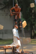 Entre en scène la deuxième marionnette humaine, perchée sur de hautes échasses et vêtue d'une cuirasse rappelant étrangement les petits personnages de bois articulés rendus célèbres par une marque de produit dépoussiérant...