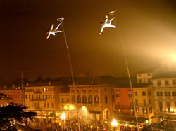 Ce duo entièrement aérien est unique en son genre par sa hauteur, sa complexité technique et surtout l’amour et la passion qui se dégage. Deux artistes funambules - perchistes se rencontrent avec grâce dans les airs. Ce spectacle fort en émotion reste gravé dans les mémoires.