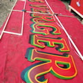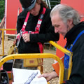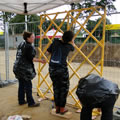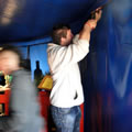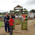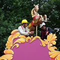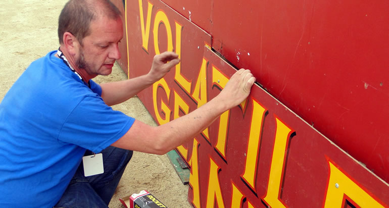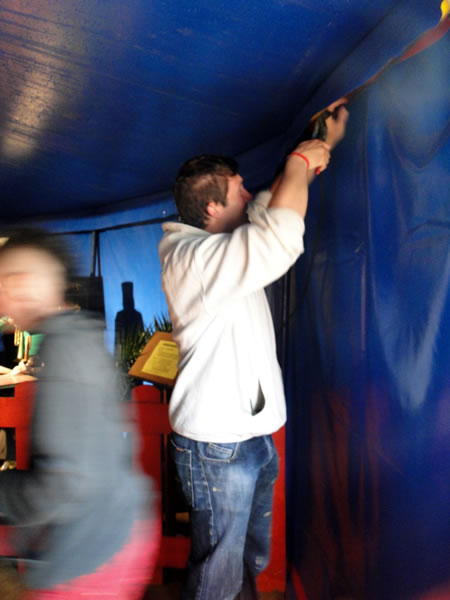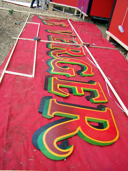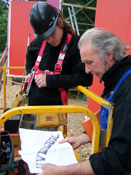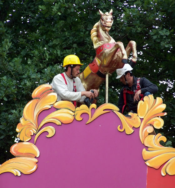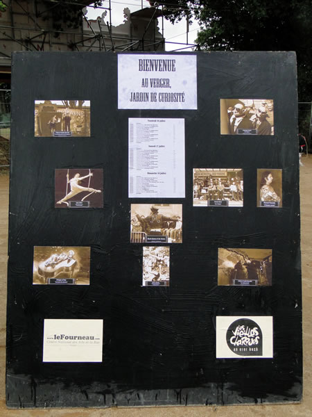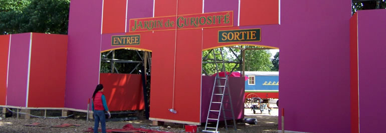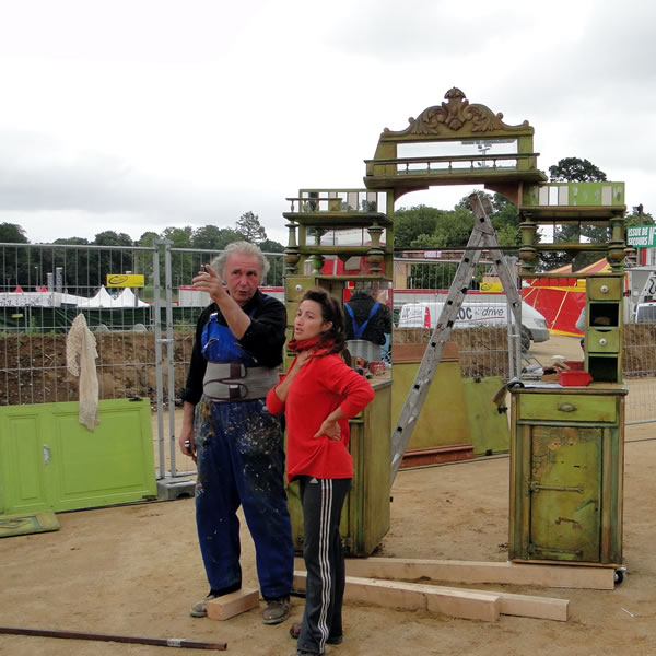 Montage des deux chapiteaux du site, installation des roulottes-loges, découpe de bois, soudure, peinture, les ateliers de bricolage fleurissent un peu partout… Pas le temps de chômer par ici ! L'installation de la porte imaginée par Gérard Burattini est le plus gros chantier de ce Verger nouveau. A deux jours de l'ouverture officielle, et alors qu'elle n'a pas dévoilée tous ses plus beaux atours, l'entrée monumentale du Verger est déjà impressionnante de hauteur et de couleurs. Vertige forain et imaginaire...