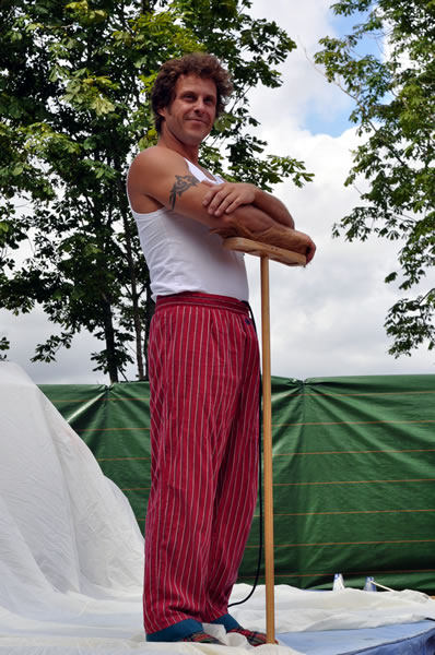 Ce Carrousel est une boîte à musiques à dormir debout, assis, couché, en chien de fusil, les pieds au ciel, en bâillant, en s’étirant, les yeux ouverts, les yeux fermés... Parfois le dormeur disparaît, s’échappe sans laisser l’adresse de son lit invisible. Parfois il cherche et trouve la compagnie d’un jeune spectateur et partage avec lui des lubies d’insomniaque : découper en morceaux du papier à musique pour le faire, en bon illusionniste, réapparaître intact. Parfois il revient en somnambule maladroit, se reprend les pieds dans le tapis de sa nuit agitée et trouve une nouvelle issue, envahie de boules blanches qu’il veut éliminer comme des papillons de nuit d’un coup de balai un peu sorcier.