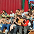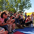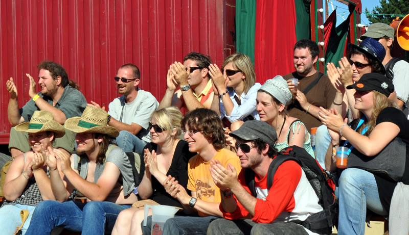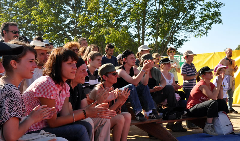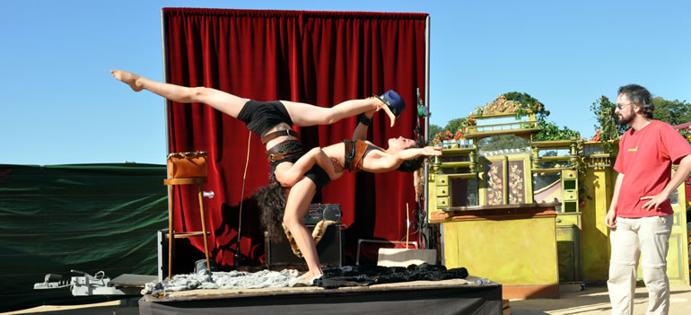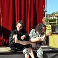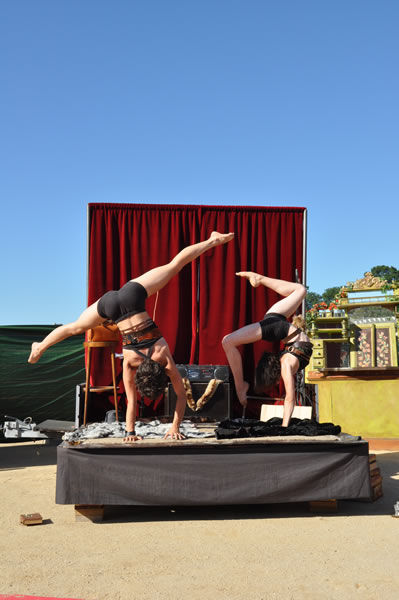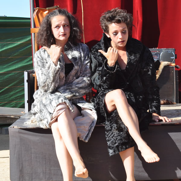 Pour présenter la Catapulte Romaine Bertha et Miranda sollicitent dans les légions de spectateurs un garçon dévoué, bien bâti, un vrai centurion de péplum hollywoodien, pas manchot de ses deux jambes, parce qu’il doit courir pour récupérer un chapeau là où il faut. Il gagne, c’est un héros. Sa récompense : du réglisse long comme un fil d’araignée. Et c’est vrai, quand on y regarde à deux fois, qu’elles ont l’air de deux arachnides, ces deux fées : quatre paires de pattes, ni ailes ni antennes, elles nous observent têtes en bas, les yeux à l’envers, le corps renversé, elles cherchent à nous séduire ces deux mômes fil-de-fer, elles cherchent à nous attirer dans leur toile et savent tout le plaisir qu’on va prendre à s’y coller. Et on s’y colle. Proies faciles que nous sommes.