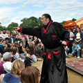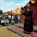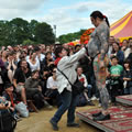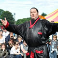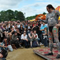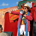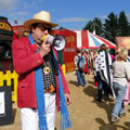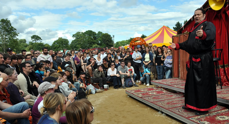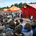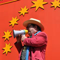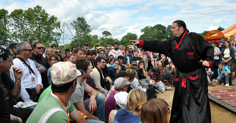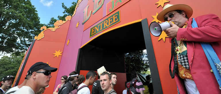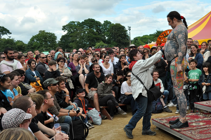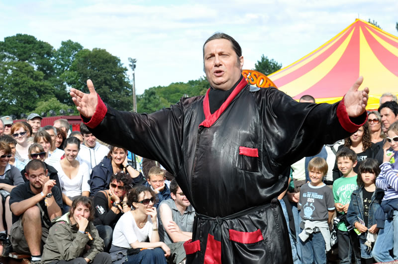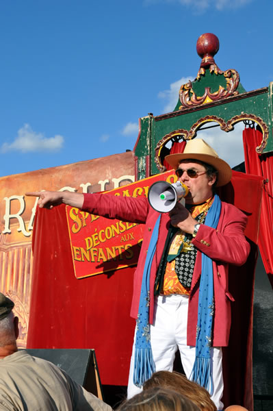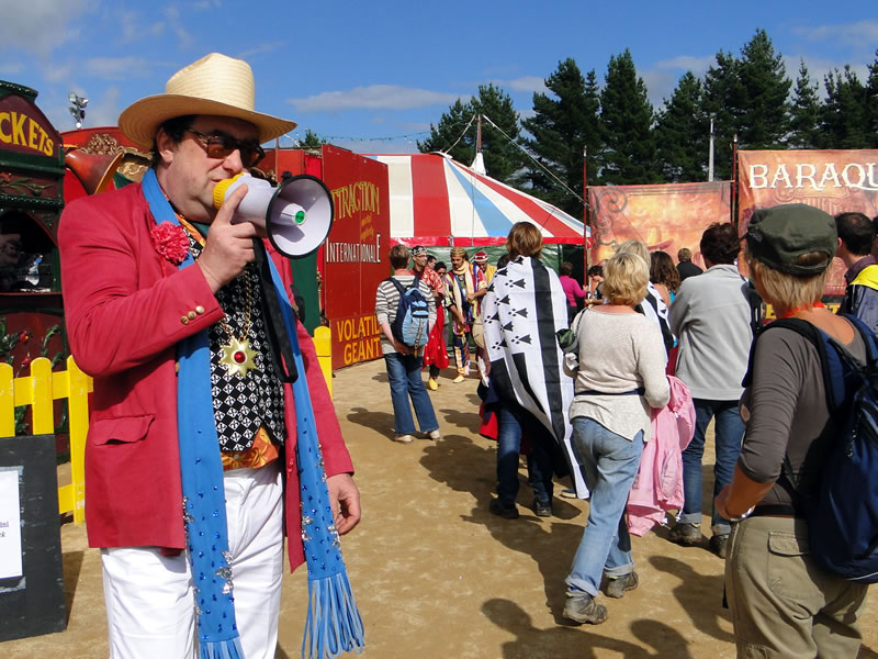 Oyez, oyez ! En 1910 il y avait le garde-champêtre et son tambour pour annoncer les bonnes et les mauvaises nouvelles dans le village. Imaginez ici, en 2010, une sorte de John Wayne en veste rouge et bleue, un Stetson couleur paille sur la tête, une étoile de shériff décrochée d'un sapin de Noël texan pendue autour du cou, des Ray-Ban, une écharpe noire et blanche, un oeillet rose à la boutonnière et portant à la main un porte-voix de syndicaliste rageur pour haranguer les foules. C'est le Crieur public du VERGER. Gilles Dubocquet tient le rôle de main de maître. Rien ne peut démarrer sans lui. Il est la clef de contact, le coup d'envoi et le starter à la fois. A l'heure dite, à quelques minutes du classique 16h16, il est devant la porte monumentale, debout sur une estrade, à ses pieds une foule impatiente et gourmande. Le Crieur accueille, racole, annonce, présente, attise le feu de la curiosité, ouvre les pistes et il a pour ainsi dire le premier et le dernier mot, avant de donner les clefs pour l'ouverture des portes. Jusqu'au soir, dernière minute du dernier spectacle, il guide et suggère un choix plutôt qu'un autre, il donne le la et connaît le VERGER comme sa poche. Approchez, approchez ! Et que la fête commence !