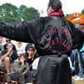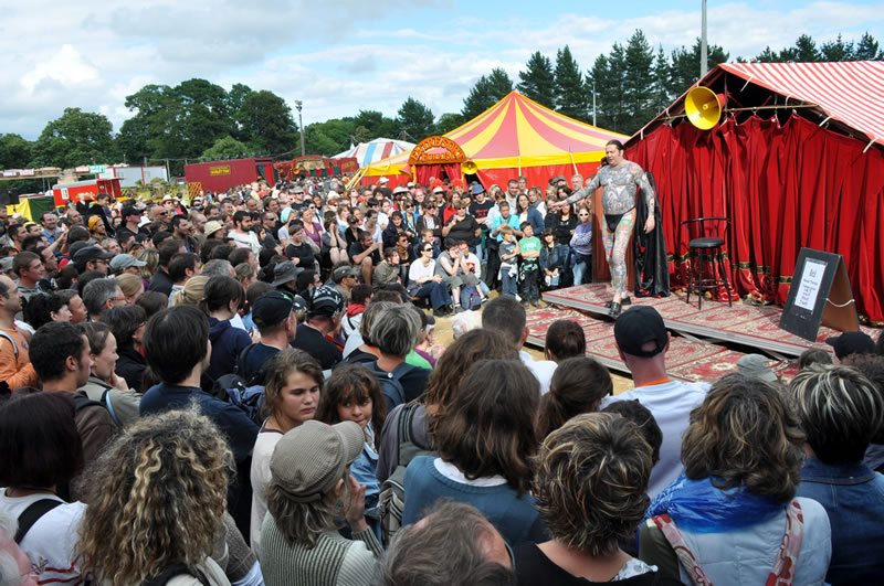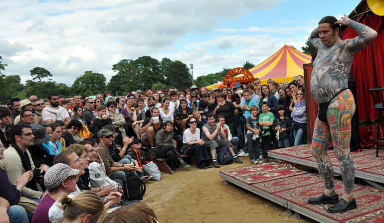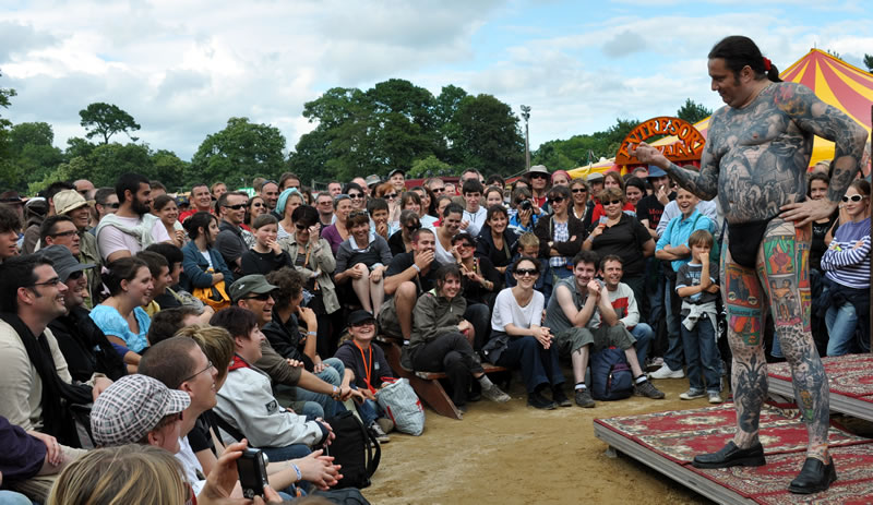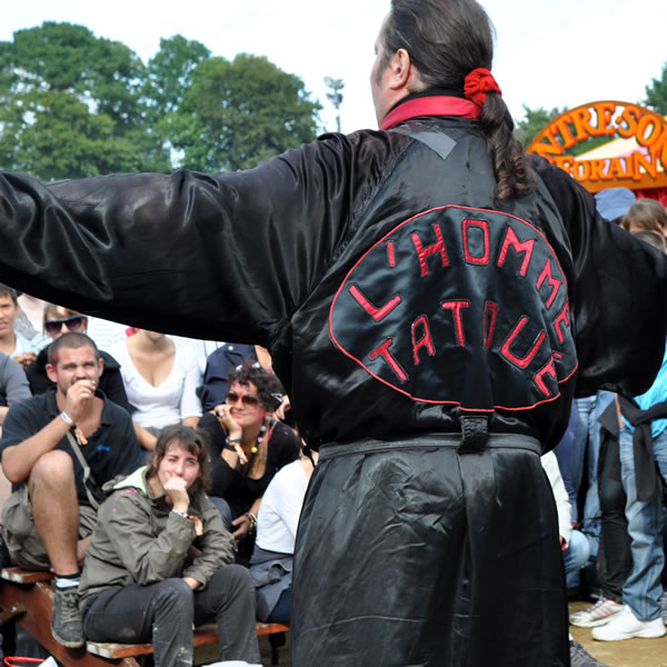 Pour Pascal Tourain, l'Homme Tatoué, "le corps est le dernier espace de liberté. Je n'ai qu'une vie", dit-il et il a fait le choix de graver sur sa peau, du cou aux chevilles, une quantité d'images et de vignettes qui lui tiennent à coeur et au corps. Pascal Tourain est un album d'images à lui tout seul. On y voit de tout sur ses bras, son torse, son ventre, ses jambes : une série de portraits des personnages de Freeks, le film culte de Tod Browning, des scènes érotiques tirées des écrits du Marquis de Sade, des images du Moyen-Age, des vignettes rouges, jaunes, bleues, vertes... comme encrées sur un tissu lisse et mouvant. Devant la peau de cet homme de deux mètres qui se présente seulement vêtu d'un string quand il a ôté sa grande robe noire de lutteur de foire, le public a des réactions diverses que l'Homme Tatoué anticipe en attribuant les rôles : ici l'étonnement, là le dégoût, ici le désir, là la tolérance... Quelques phrases pimentées choquent ou font rire. Mais, avant que Pascal Tourain ne se rhabille, chacun aura compris son choix extrême : faire de sa peau une sorte de Musée vivant et précieux dans lequel l'Homme Tatoué vit librement chaque seconde de sa vie.