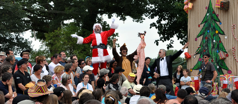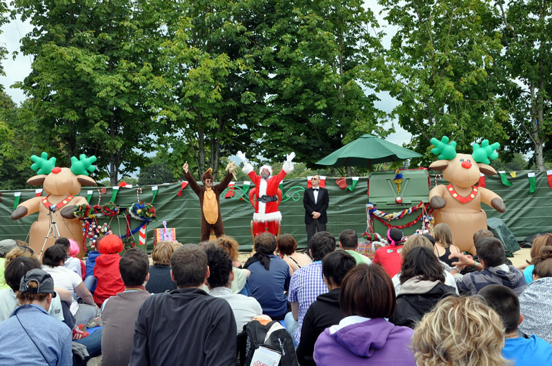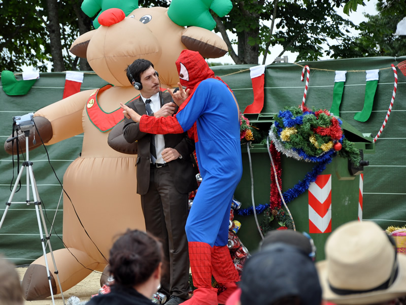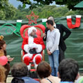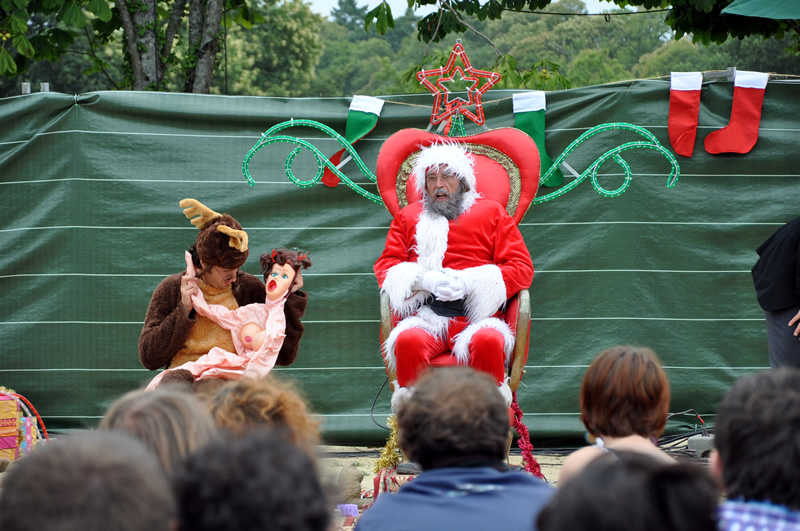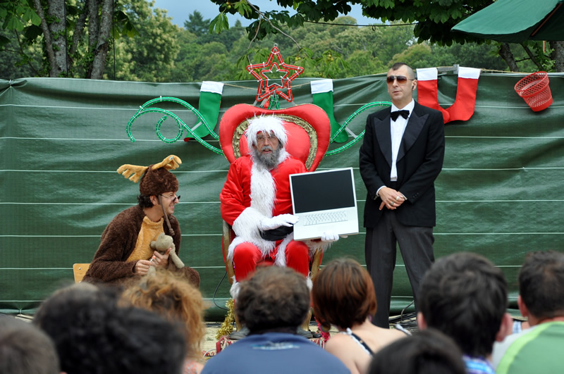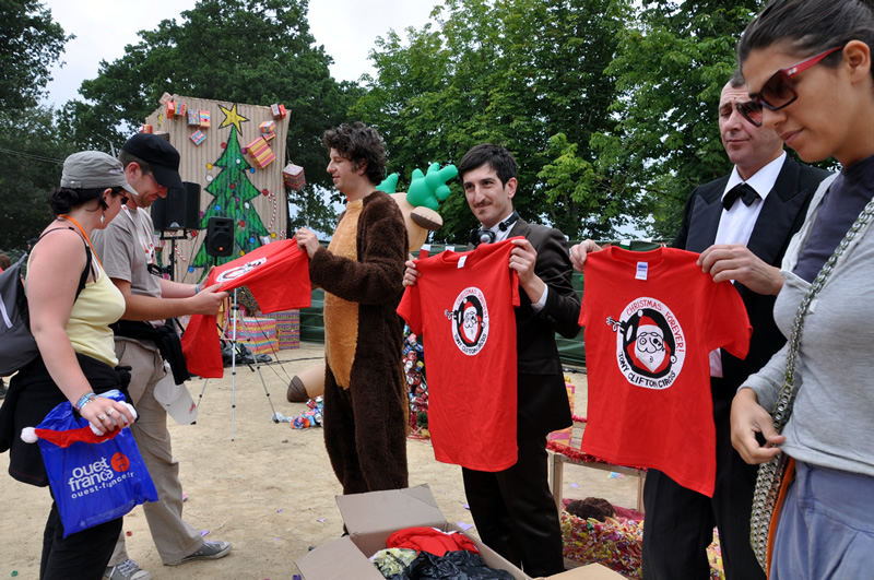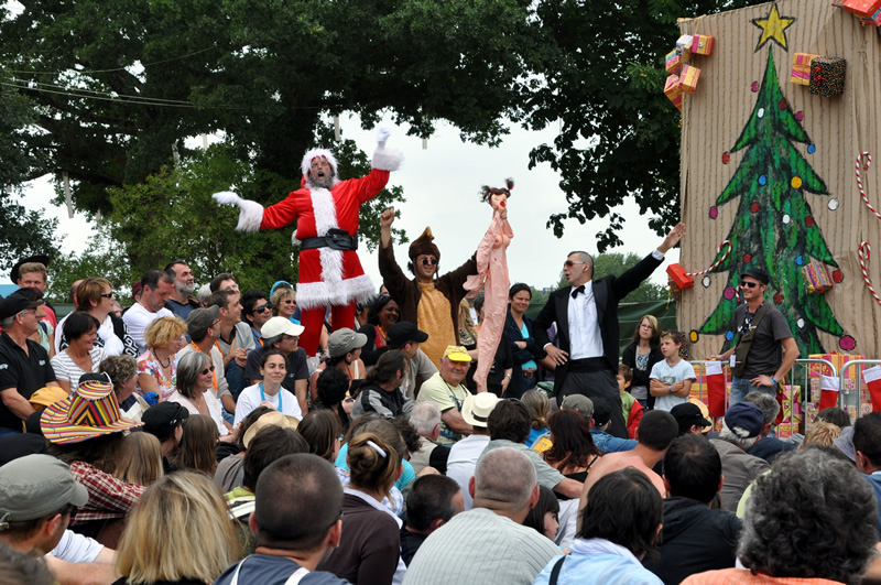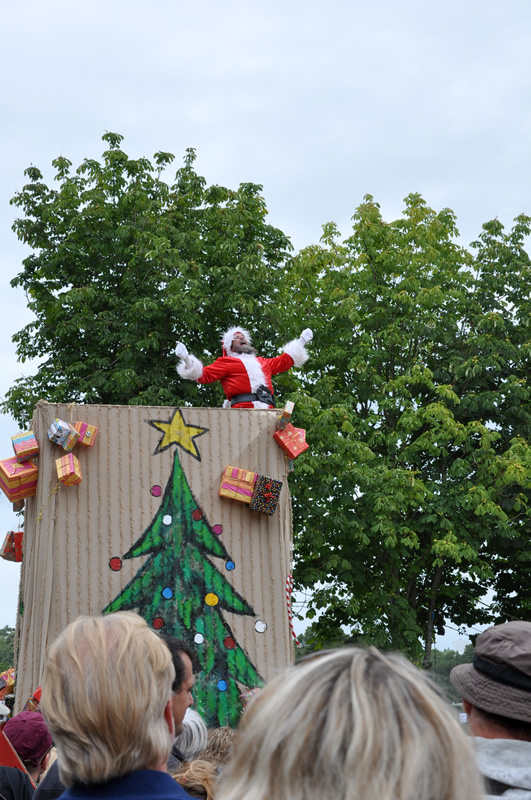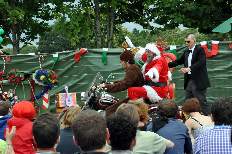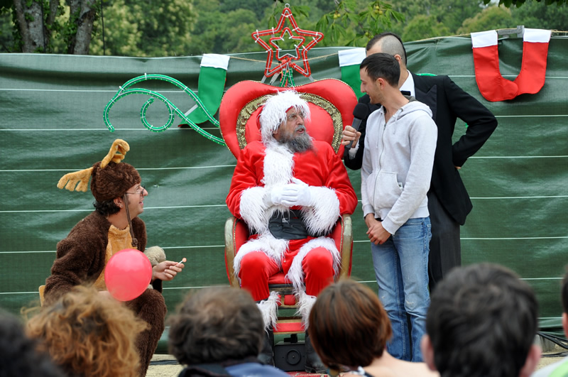 Oui oui, nous sommes à Carhaix, en plein mois de juillet et, non, personne n'est sous l'emprise d'opiacés. Mais que croyez-vous ? Que toute l'année durant, Papa Noël attend sagement devant la cheminée de sa petite chaumière lapone que le 24 décembre arrive pendant que ses lutins s'activent ? Détrompez-vous donc ! Car s'il est à Carhaix en ce moment, c'est qu'il mène de front sa « Christmas forever tour 2011 ». Du ballon de baudruche à la cartouche de Marlborro, en passant par le paquet de chips et le cheval, il n'y a qu'à demander : Papa Noël vous distribue tout ce qui vous fait rêver. Car nous vivons ici dans « le meilleur des mondes possible » dans lequel tous nos désirs peuvent être exaucés. Oui les enfants, tous nos désirs... il suffit juste de se servir ! Ne croyez pas les parents qui vous rabâchent sans cesse leur manque d'argent, car le raisonnement du Père Noël est simple : Méchants les parents qui n'achètent pas de cadeaux à leurs enfants ! Car un outils formidable existe : la carte bleue ! Quoi ? Vos parents n'ont pas de carte bleue ? Les méchants n'avaient qu'à travailler plus ! Tu veux un ordinateur portable ? « Mais bien sûr tu l'auras ! Un jour, tu verras, tu l'auras ! ».