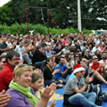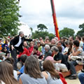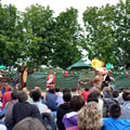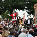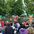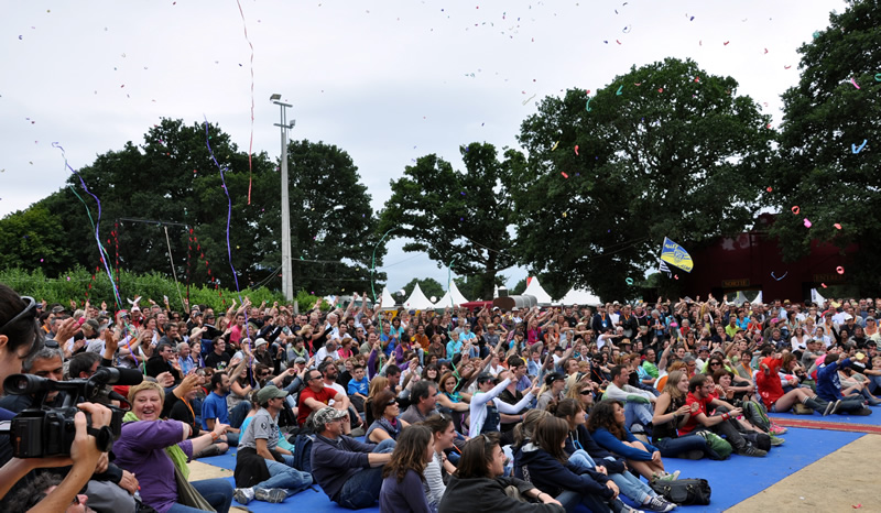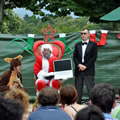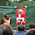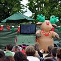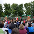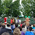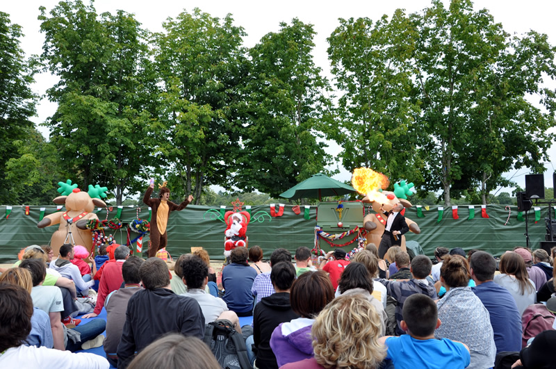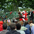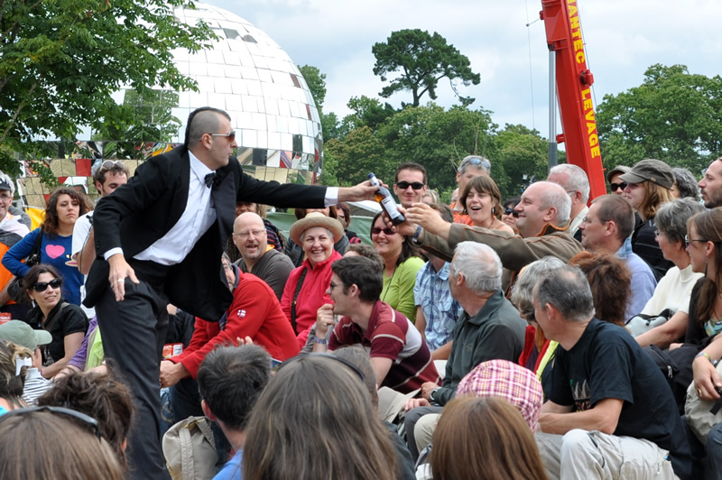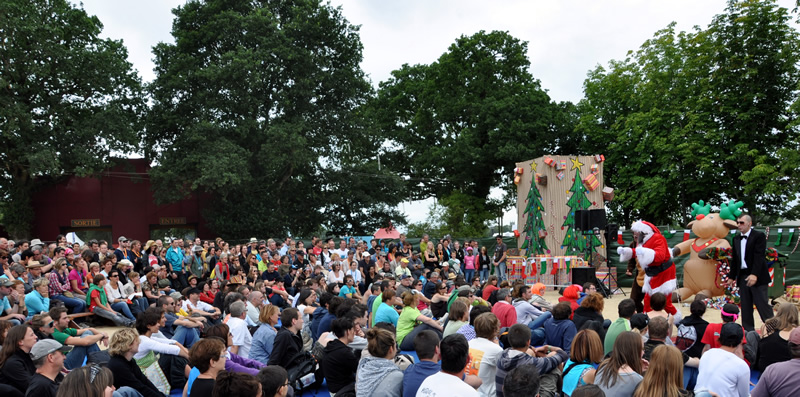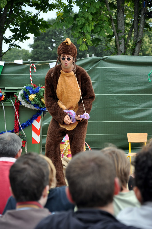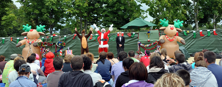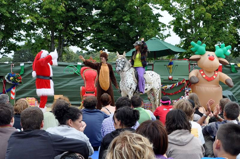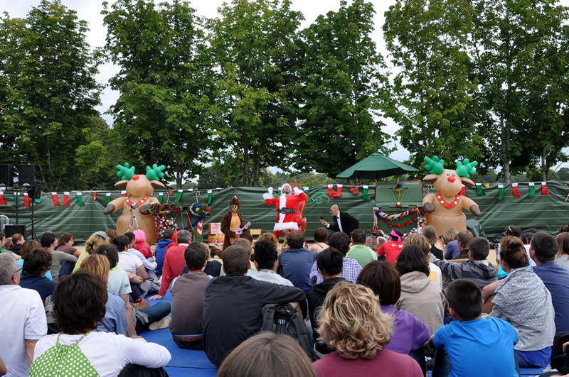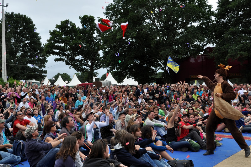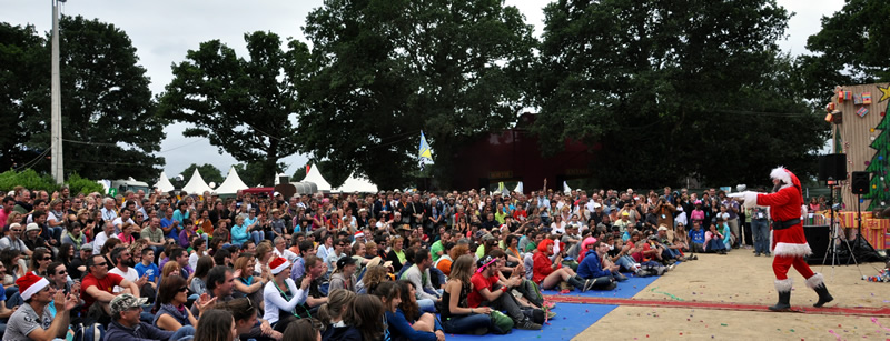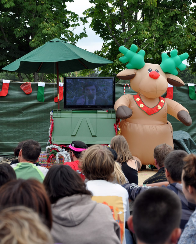 Oui oui, nous sommes à Carhaix, en plein mois de juillet et, non, personne n'est sous l'emprise d'opiacés. Mais que croyez-vous ? Que toute l'année durant, Papa Noël attend sagement devant la cheminée de sa petite chaumière lapone que le 24 décembre arrive pendant que ses lutins s'activent ? Détrompez-vous donc ! Car s'il est à Carhaix en ce moment, c'est qu'il mène de front sa « Christmas forever tour 2011 ». Du ballon de baudruche à la cartouche de Marlborro, en passant par le paquet de chips et le cheval, il n'y a qu'à demander : Papa Noël vous distribue tout ce qui vous fait rêver. Car nous vivons ici dans « le meilleur des mondes possible » dans lequel tous nos désirs peuvent être exaucés. Oui les enfants, tous nos désirs... il suffit juste de se servir ! Ne croyez pas les parents qui vous rabâchent sans cesse leur manque d'argent, car le raisonnement du Père Noël est simple : Méchants les parents qui n'achètent pas de cadeaux à leurs enfants ! Car un outils formidable existe : la carte bleue ! Quoi ? Vos parents n'ont pas de carte bleue ? Les méchants n'avaient qu'à travailler plus ! Tu veux un ordinateur portable ? « Mais bien sûr tu l'auras ! Un jour, tu verras, tu l'auras ! ».