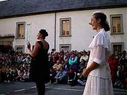 | Autant être franc... même avec du culot, un cyber-reporter ne peut pas se permettre de bousculer cinquante personnes pour obtenir une belle photo. C'est donc en équilibre instable sur les doigts de pieds que celles-ci ont été prises... De toute façon, le Carmen Funèbre de la compagnie polonaise Biuro Podrozy, il fallait y être! Une odeur de mort a plané sur la place de la mairie, et ce carmen-là n'était pas un conte à la Mérimée. On l'aurait plutôt cru sorti des livres d'hisoire... Si les jeunes spectateurs ont un peu de mal à résumer le spectacle, c'est que c'est un théâtre à vivre, qui ne se raconte que difficilement.Un théâtre fait pour résonner en chacun des spectateurs, comme l'explique une comédienne. Quant aux adultes, certains considèrent que ce qu'ils ont vu valait qu'on les prévienne... Qu'en pense la comédienne? | |