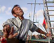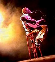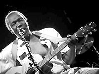 | 22h39, l'ambiance se fait plus jeune et la musique un peu plus électrique. L'ougandais Geoffray Oryema propose des chansons issues des rythmes du blues dans lesquelles on reconnaît bien le chant populaire des Noirs américains ainsi que ceux de la soul musique. | ![]() |