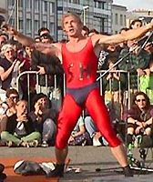 un cercle se forme autour du duo acrobatique de la compagnie Pi R2 ; Nico