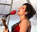 | 21h02, Une grande scène abrite le groupe Ekova qui était invité au printemps de Bourges de cette année. Trois musiciens de nationalité différente entourent une chanteuse aux allures de poupée russe et souriante comme une geisha. | ![]() |