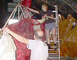 | Le montage des animaux marins, composés de tiges de métal et papier plastifiés, est un travail minutieux | |||