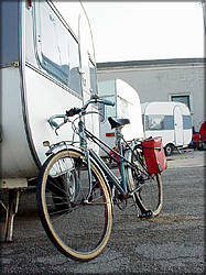 "Un vélo et trois des douze caravanes des descendants Fournel. A l'heure où j'ai pu prendre la photo, ils dormaient encore. C'était le matin à 8h, il fallait que je rejoigne la gare..." |