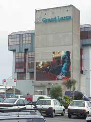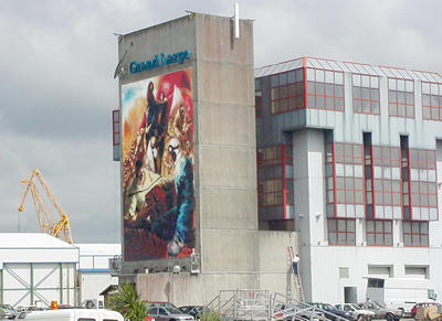 ![]() Lundi 19 juin, 15h. Le montage de la fresque sur le batiment du Grand Large du Port de Commerce. |