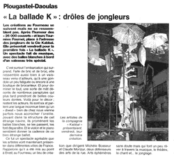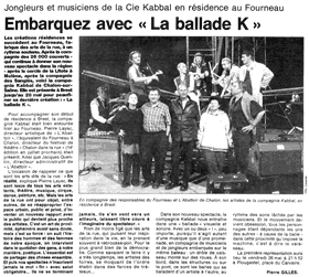 "Escale au bourg de « La Ballade K » : poésie contre mécanique" (Compte-rendu, 30/05/00) "Des Bourguignons au Fourneau : les arts de la rue tissent leur toile" (Annonce, 11/05/00) (ces articles ne sont plus disponibles sur le site du journal)