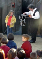 Un univers burlesque et poétique... Une canne qui se transforme en ceinture, une corde qui finit par l'entortiller, des anneaux qui s'empêtrent... On l'aura compris, l'assistant Tic Tac se débat en permanence et sans succès avec les accessoires de la star ! Mais quand TUMA et les grandes illusions s'en mêlent, l'humour fait place au rêve... |