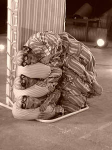 : un dortoir en transit. Neuf lits montés sur roues traversent