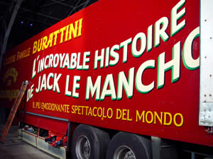 | Ce spectacle conte la vie de Jack, mauvais comédien, sans charisme, et pour couronner le tout managé par un bonimenteur véreux. Il sera tour à tour Artiste de music-hall, Amoureux transi, Alcoolique invertébré, Pilote émérite dans l’armée de l’air américaine, pour finir Manchot dans un entresort... "Jack est infirme de son talent, et un infirme devient vite un phénomène de foire", à la fin de sa vie, il trouve refuge dans la baraque de ses débuts, chez Burattini. | ![]() |