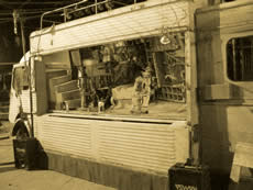 "Je me souviens de la crèche à moteur... Quand il arrivait, chaque année à la même époque, Mr Huet garait toujours son camion bien à plat. A la fin de la manoeuvre, c’est lui qui mettait les cales. Alors, les gars pouvaient commencer le montage du gradin et des bâches. Il avait embauché deux gars, à la saison et au pourcentage, pour l’aider à monter le décor, à entretenir la mécanique, mais surtout, à faire bouger les automatiques. Parfois, il mettait un peu de musique pour faire patienter avant l’ouverture du rideau publicitaire... Le rideau publicitaire, c’était des réclames pour les artisans du coin, pour les commerçants ou pour quelques connaissances à lui. Ca nous occupait avant le début, on faisait des jeux. Ca s’ouvrait avec la musique du carillon, et là, on retrouvait les vieux automatiques comme chaque année, à leur place, comme si ils n’avaient jamais bougé. |