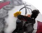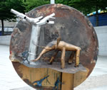 Fidèle à ses habitudes, le sculpteur travaille essentiellement avec des matérieux usagés, rejetés : des pot d’échappement, vieux portables, poupées Barbies,... " pour les faire parler autrement ".