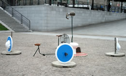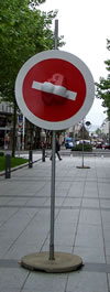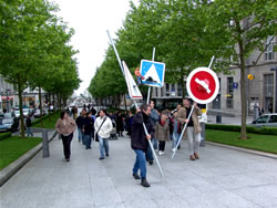 ... et la ville est silencieuse. Pourtant, il se passe de drôles de choses Place de la Liberté : des poteaux assez haut à distance régulière sont installés jusqu’en haut de la rue de Siam. Le jour se lève en même temps que le mystère : des panneaux signalétiques ! Enfin, pas ceux que vous croisez tous le jours sur les routes et les chemins des campagnes. Non, ceux-ci sont plus originaux, mais aussi plus stylisés. Jugez-en plutôt : un rond-point avec un toilette au centre, un panneau annonçant un passage piéton (et " La Chose "), un autre où l’on distingue un éléphant et un arbre, un sens-interdit agrémenté d’une paire de fesses,... Mais quel est ce bazar ?