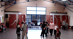 En résidence à Saint-Thégonnec, les compagnies Tango Sumo et Vendaval ont pris rendez-vous avec les élèves de l'école primaire du Sacré coeur de Saint-Thégonnec dans l'après-midi du mardi 15 mai 2007, deux jours après leur escale au Mai des Arts à Plougonven, afin de leur faire découvrir « Les Noces de Trottoir », une nouvelle création. Pas de cours, un spectacle en prime, bref que du bonheur pour ces jeunes écoliers! Pendant une demi-heure, le jeune public a pu apprécier certains passages de cette création. |