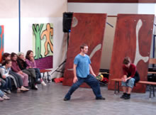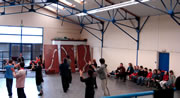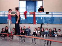 La rencontre se fait dans une salle à proximité de l'école. « Comment il fait ça ? », « regarde!! », « il est souple, dis donc! » : les enfants restent bouche bée à regarder les artistes s'échauffer avant de débuter leur représentation. Et ce n'est que le début. |