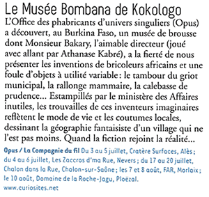 Le musée Bombana de Kokologo nous vient du Burkina Faso, pays des hommes intègres. Son conservateur attitré, M Bakary, vous présentera avec enthousiasme et conviction une collection de curiosités et d'inventions africaines à utilité variable, dignes de figurer au sommaire du catalogue des objets introuvables... Entre tradition et modernité, le musée Bombana de Kokologo pose un autre regard sur l'Afrique de la débrouille, et expose avec humour un des aspects décalés de ses héritages et de son avenir. A l'occasion des présentations sur le territoire national, M Bakary sera accompagné par un membre du Conservatoire des Curiosités.
