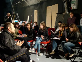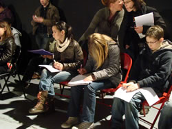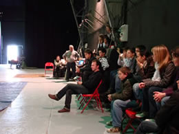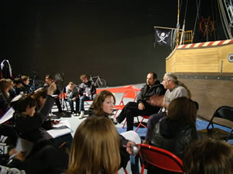 Lundi 18 mai, la compagnie, en résidence de re-création au Fourneau depuis le 12 mai, reçoit la visite d'une classe de sixième du Collège des Monts d'Arrée. Une rencontre qui s'est faite dans le cadre d'un jumelage culturel mis en place par Le Conseil Général. |