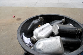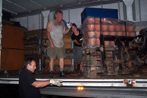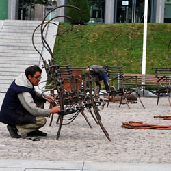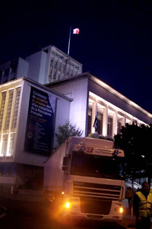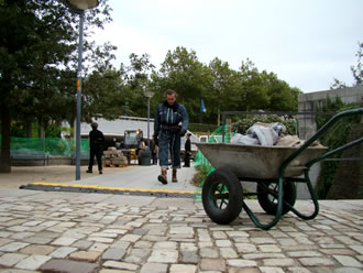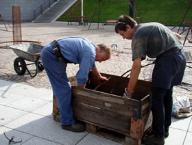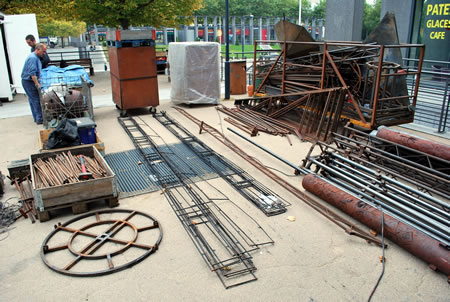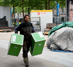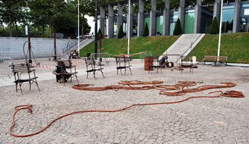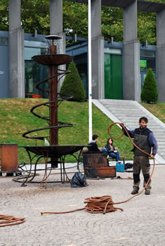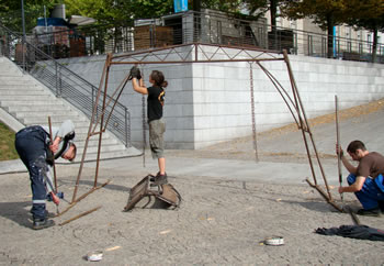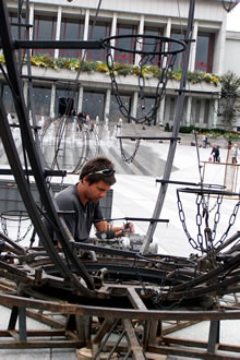La Compagnie Carabosse et l'équipe du Fourneau travaillent sur l'installation de la création enflammée écrite pour la place de la Liberté de Brest.