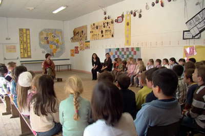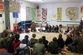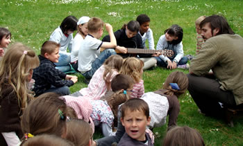 Les élèves ont également eu la chance de pouvoir s'essayer à la guitare, gracieusement prêtée par David. Les enfants vont à présent réaliser un travail écrit autour de cette rencontre et la compagnie et les élèves, ravis de cette entrevue se sont déjà redonnés rendez vous jeudi 7 mai pour la lecture des textes des enfants. |