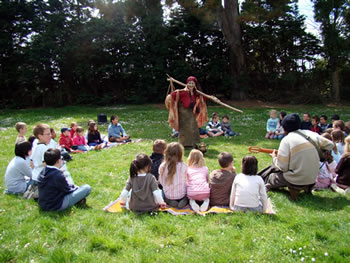 « Venez avec moi dans ma maison », les élèves émerveillés et impressionnés par cette métamorphose, suivent la vieille femme avec entrain jusqu'à la pelouse de la cour de l'école, où aura lieu la représentation. Bien installés sur les nattes, au soleil, les élèves se prêtent facilement au jeu, goûtent les dattes et le thé que leur offre la vieille femme. |